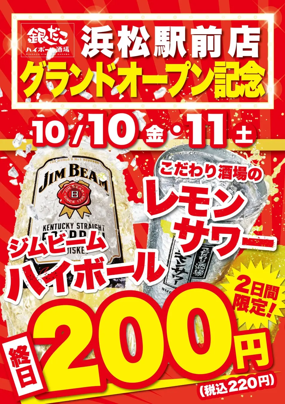 ドリンクはハイボールをはじめ、ビール、各種サワー、焼酎、そしてノンアルコールまで多彩なラインナップでお楽しみいただけます。「たこ焼」と「ハイボール」で最高の一杯をご堪能ください。さらに、テイクアウト(一部商品を除く)にも対応しておりますので、ご自宅やお出かけ先でも銀だこの ぜったいうまい‼たこ焼を楽しめます。また、オープンを記念して2025年10月10日(金)と11日(土)の2日間は、銀だこハイボール酒場浜松駅前店限定 で、グランドオープンキャンペーンを実施します。内容は、こだわり酒場レモンサワーとジムビームハイボールが、何杯飲んでも 終日1杯220円 で飲むことができます。この機会に是非お寄りください。