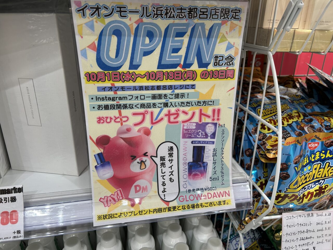 2025年10月1日にオープンした日用品・化粧品のアウトレットストアDream marketイオンモール浜松志都呂店には、オープン依頼たくさんの人々が訪れています。コスメを初めとした日用品がアウトレット価格で販売しているため、道行く人が気になってお店の中へ入っていくすがたが見受けられました。