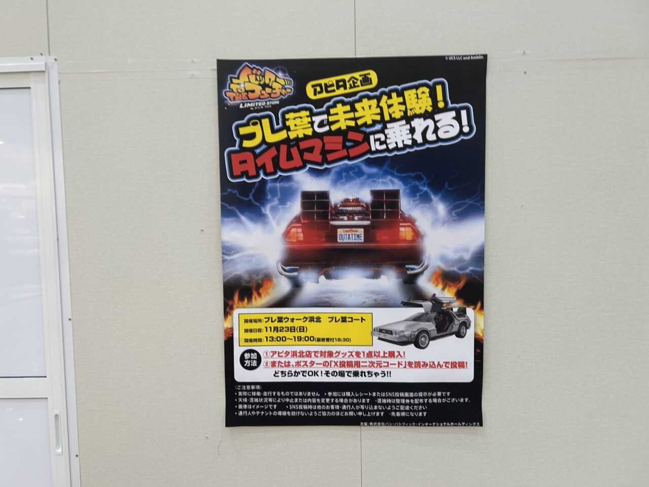 プレ葉ウォーク浜北に2025年11月23日(日)にバックトゥーザフューチャーのデロリアンがやってきますバックトゥーザフューチャーは、2025年で映画公開から40周年を迎える大人気映画です。40年経っても衰えることがありません。デロリアンは、エメット・ブラウン博士が、自らの愛車であるデロリアンを改造して製作したタイムマシンのことです。2025年11月15日にMEGAドン・キホーテ和泉中央店にもやってきていたというデロリアン、東京の展示を終えて浜松を経て、大阪に回るようです。浜松でみることのできる最後の日、それが11月23日(日)のプレ葉ウォーク浜北です。13時から19時の6時間の限定です。しかも、見るだけではなくタイムマシンに乗ることも叶います。ただし、乗るには条件があります。店内で対象グッズを1点以上購入するか、ポスターのX投稿用二次元コードを読み込んで投稿するか、のどちらかで乗ることができるそうです。バックトゥーザフューチャーファンや車好きにはたまらないイベントになりそうです。