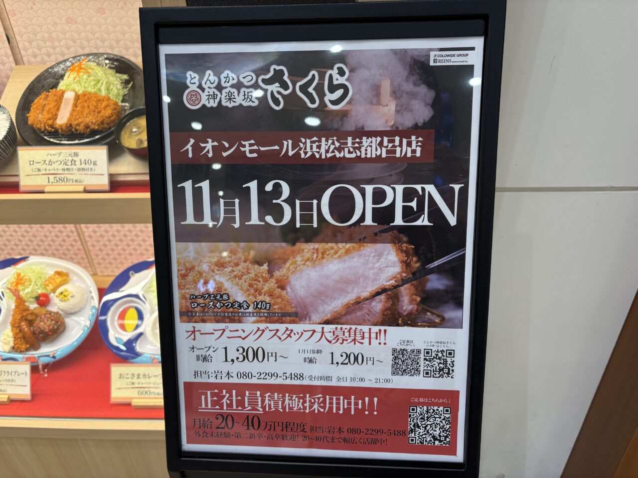 とんかつ神楽坂さくらイオンモール浜松志都呂店が2025年11月13日(木)にオープンしました。1階のデリマルシェゾーンのおひつごはん四六時中と千里屋の間の店舗です。以前。串家物語があった場所になります。2023年8月31日に閉店してから長い間空き店舗だった場所にやっと新しいお店が入り、また賑やかになりそうです。とんかつ神楽坂さくらは、東京の神楽坂に本店を持ち、全国にたくさんの店舗がオープンしているお店です。静岡県でこのイオンモール浜松が初出店となります。調べてみたところ、とんかつ神楽坂さくらは、姉妹店にあじフライ神楽坂さくらがありました。あじフライととんかつを提供しているお店でフードコート専門のお店のようです。実は、あじフライ神楽坂さくらはイオンモール浜松市野の2階フードコート内にあります。今回お知らせしたイオンモール浜松志都呂の店舗はフードコートではないため、とんかつ神楽坂さくらとしてオープンし、メニューも異なるものを提供しています。こだわり抜いたとんかつがお待ちしています。