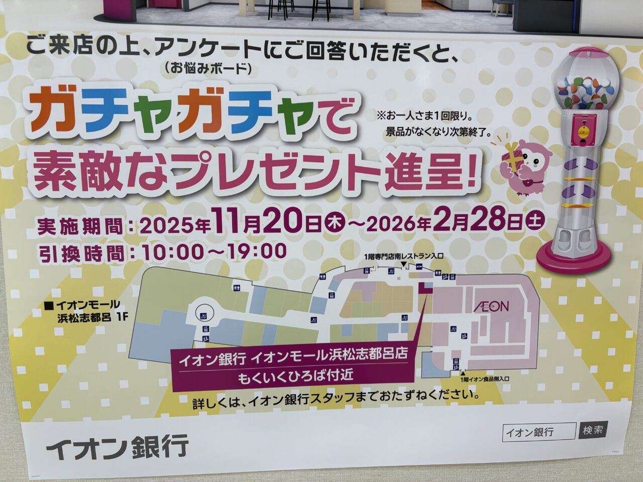 ぜひこの機会に、イオン銀行を利用してみませんか?今なら、簡単なアンケートで2026年2月28日まで、ガチャガチャで素敵なプレゼントもらえます。店舗は、1階デリマルシェゾーンの千里屋の向かいになります。