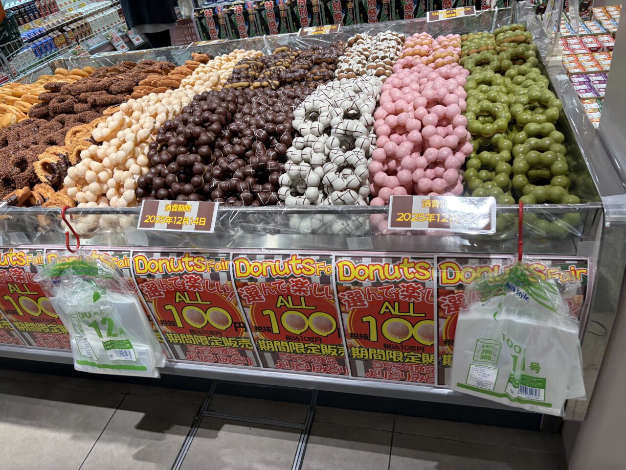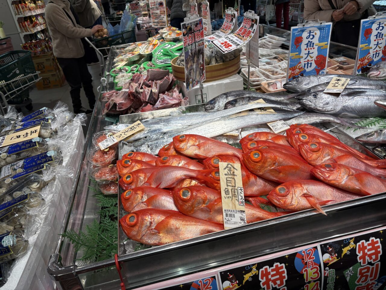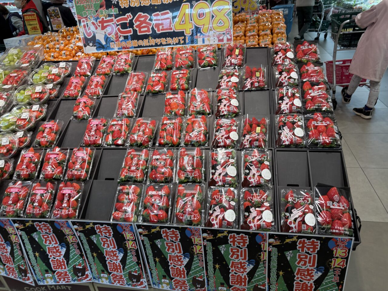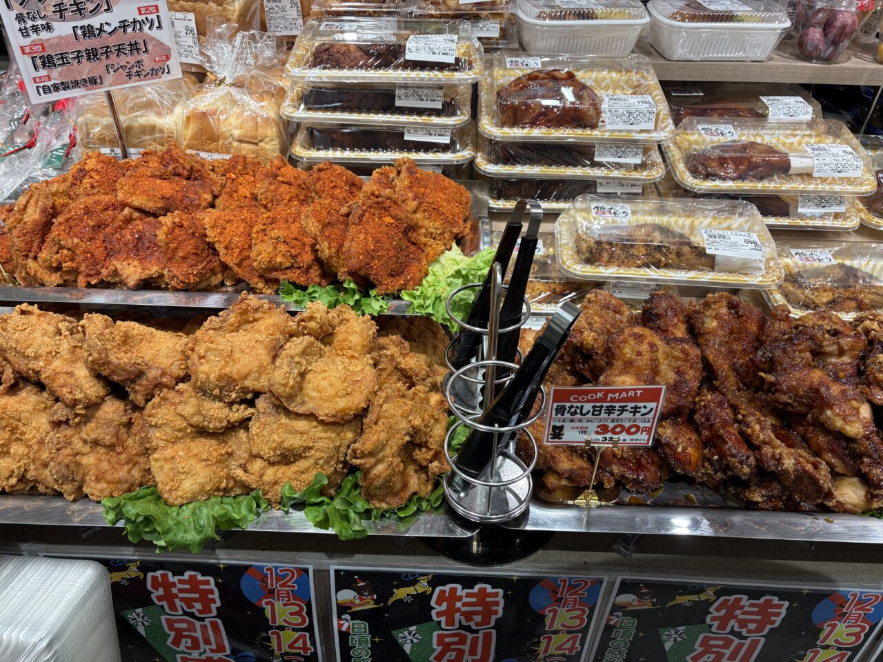 先日お知らせした、クックマートの特別感謝際に行って来ました。前回は、夕方行ったため棚が空の商品もあり、感謝祭の実態がしっかりお届けできませんでしたが、今回は午前中の内に行くことができました。駐車場もいつもより混雑してはいましたが警備員さんも3人程いて、回転がはやくスムーズでした。どの商品もとにかく並んでいる数が多いです。いつもの3倍くらいは積まれているイメージでした。値段もお手頃価格のものが多く、あれもこれもカゴに入れてしまいます。お野菜も、鮮魚も、気合いを入れて仕入れたのが分かります。普段からある商品はもちろんですが、いつもなら無い商品と出会えるのも感謝祭の醍醐味です。まだまだ、高くて入手困難ないちごもこのお値段で。金目鯛1匹も1,000円以内という価格でした。その他にも、脂がのったお刺身や、前回おすすめした甘口鮭などお買い得商品盛り盛りでした。その他にも、1個100円のドーナッツコーナーや、クックマートのお惣菜で人気ナンバーワンだと書かれていた骨なし甘辛チキンなど、山になっていました。お惣菜コーナーはいつも人気ですが、感謝祭はそれ以上に賑やかで、お弁当やお惣菜が高く積まれていました。感謝祭のためにご夫婦でお買い物している方も多く見受けられました。みなさんかごいっぱいにお買い物されていました。特別感謝祭は、クックマート全店で2025年12月14日(日)まで開催中です。