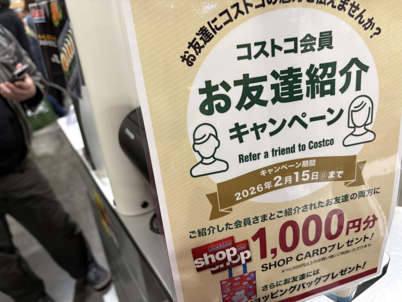 コストコ浜松倉庫で2026年2月15日までコストコ会員お友だち紹介キャンペーン実施中です。2025年12月8日からスタートしているこのキャンペーンですが、毎年この時期になると行なわれている恒例行事になっています。コストコへの入会を検討している方はこの時期の入会が非常にお得です。キャンペーンへの参加の仕方は、知り合いにコストコ会員がいる方は、一緒に来店するのが1番簡単な方法です。一緒に行けない場合はお友だちの会員番号(8で始まる11桁)を教えてもらって来店しても可能です。また、今年から導入された新しいシステムとして、お友だちに会員がいない場合も会員じゃない人同士2名以上でコストコへ来店すると適用されます。会員になるためには本人確認書類が必要ですので忘れないようにしましょう。また、その場で顔写真を撮ることになるのでそれも知っておいてください。今回のキャンペーンの特典は、紹介者も紹介された人も1,000円分のショップカードのプレゼントがあります。ただし、10,000円以上購入の際にのみ使用可能なカードですのでお気を付けください。また、紹介された方にはコストコのショッピングバッグのプレゼントもあります。ぜひこの機会にご検討されてはいかがでしょうか。