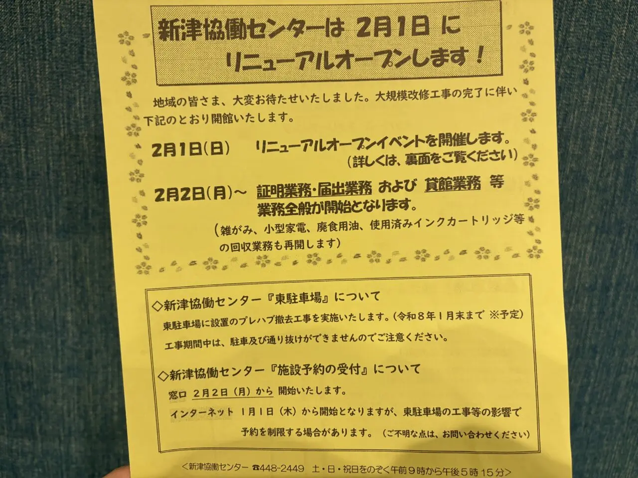 工事期間中は、証明業務・届出業務や施設の貸館業務(体育館一般開放を含む)など、業務全般が休止していました。地域の方々には心待ちのリニューアルオープンかと思います。