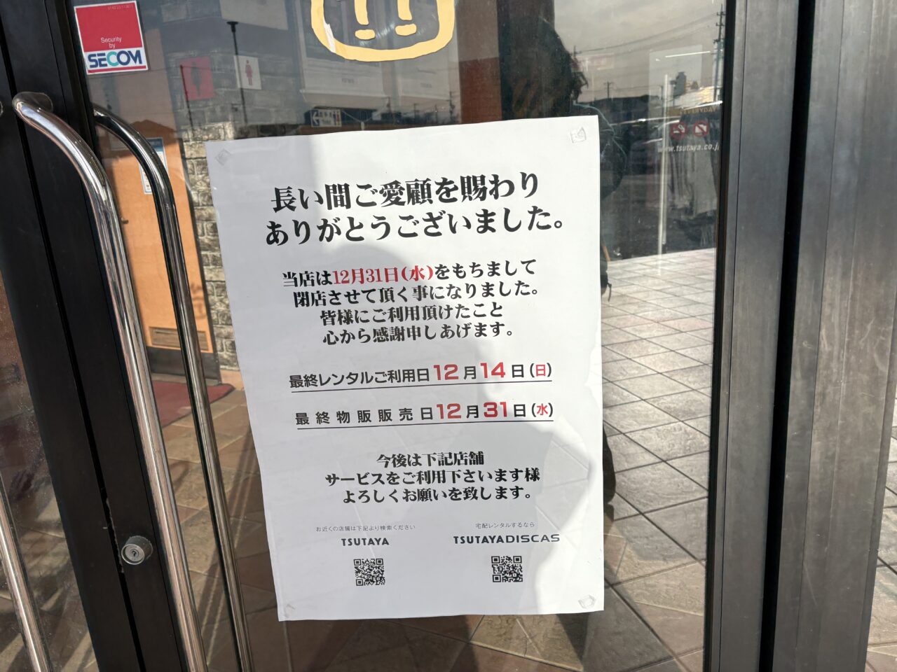 本、CD、DVDの販売やレンタルをしていたTSUTAYA中央店が2025年12月31日をもって閉店してしまいました。