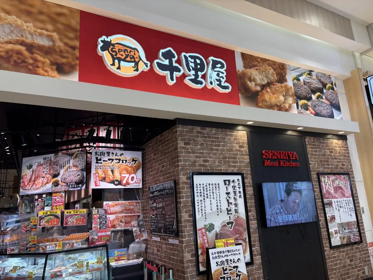 イオンモール浜松志都呂の千里屋は、お肉屋さんです。新鮮なお肉やお惣菜が毎日ショーウィンドウに並び、たくさんのお客さんが並んでいます。特にお惣菜コーナーは大人気です。全国で14店舗ありますが、取り扱っている商品やセールなどは店舗ごとに異なり地域性があるようです。お惣菜コーナーの上の方には揚げ物が並んでいて、その中の看板商品は何と言ってもお肉屋さんのビーフコロッケです。1個75.6円(税込)の激安コロッケです。お肉屋さんならではの肉汁たっぷりなビーフコロッケで、1度食べるとやみつきになり、リピーターも多い一品です。食事のおかずにも、育ち盛りの子どもたちのおやつにも最適です。お肉屋さんでしか作れないジューシーでホクホクなコロッケはおすすめです。