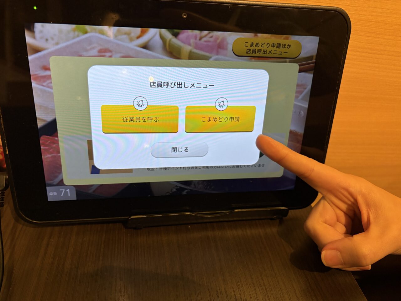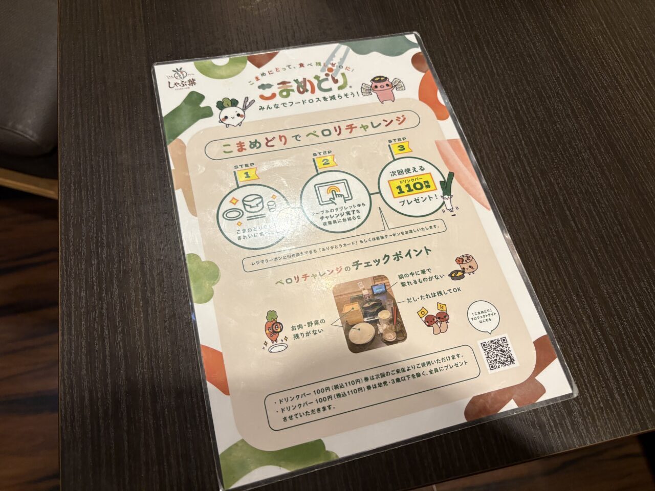 しゃぶ葉はすかいらーくグループが経営しているしゃぶしゃぶのお店で、リーズナブルな食べ放題が人気の全国チェーンです。浜松市には浜松和田店と浜松入野店の2店舗あります。しゃぶしゃぶはあっさり食べられ、お野菜も多く、手作りできるデザート系もあるので、老若男女の幅広い層から好まれるお店になっています。今回は、浜松入野店で「こまめどり」をやってみました。やってみましたという程だいそれたことではないのですが、しゃぶ葉のSDGsの取り組としてフードロスをなくすため以前から掲げられていたものでしたが、やり方などが常に更新されています。現在(2026年2月)の参加方法をお伝えします。まずは、終了時間いっぱいまで食事を楽しみます。この際、決して一気に取りすぎて、残してしまわないようにこまめにとることに気を付けます。残飯ゼロ(タレや出汁は大丈夫です)で食事を終え、テーブル上をキレイに整えます。チェックと片付け完了後、タッチ画面の右上の「こまめどり申請ほか店員呼出メニュー」をタッチします。そして、「こまめどり申請」をタッチします。するとスタッフさんがやってきてテーブルの上のお鍋やお皿の中にお残しがないか見てくれ、OKだとカードをもらえます。このカードを会計の際に渡すと、ドリンクバーが税込100円になるクーポンがいただけます。ドリンクバーは、普段税込299円での提供なので嬉しいです。以前は、自分で写真を撮ってレジで申請するシステムでしたが、現在はこのような方法になりよりたくさんの人が取組みやすくなっったのではないでしょうか。