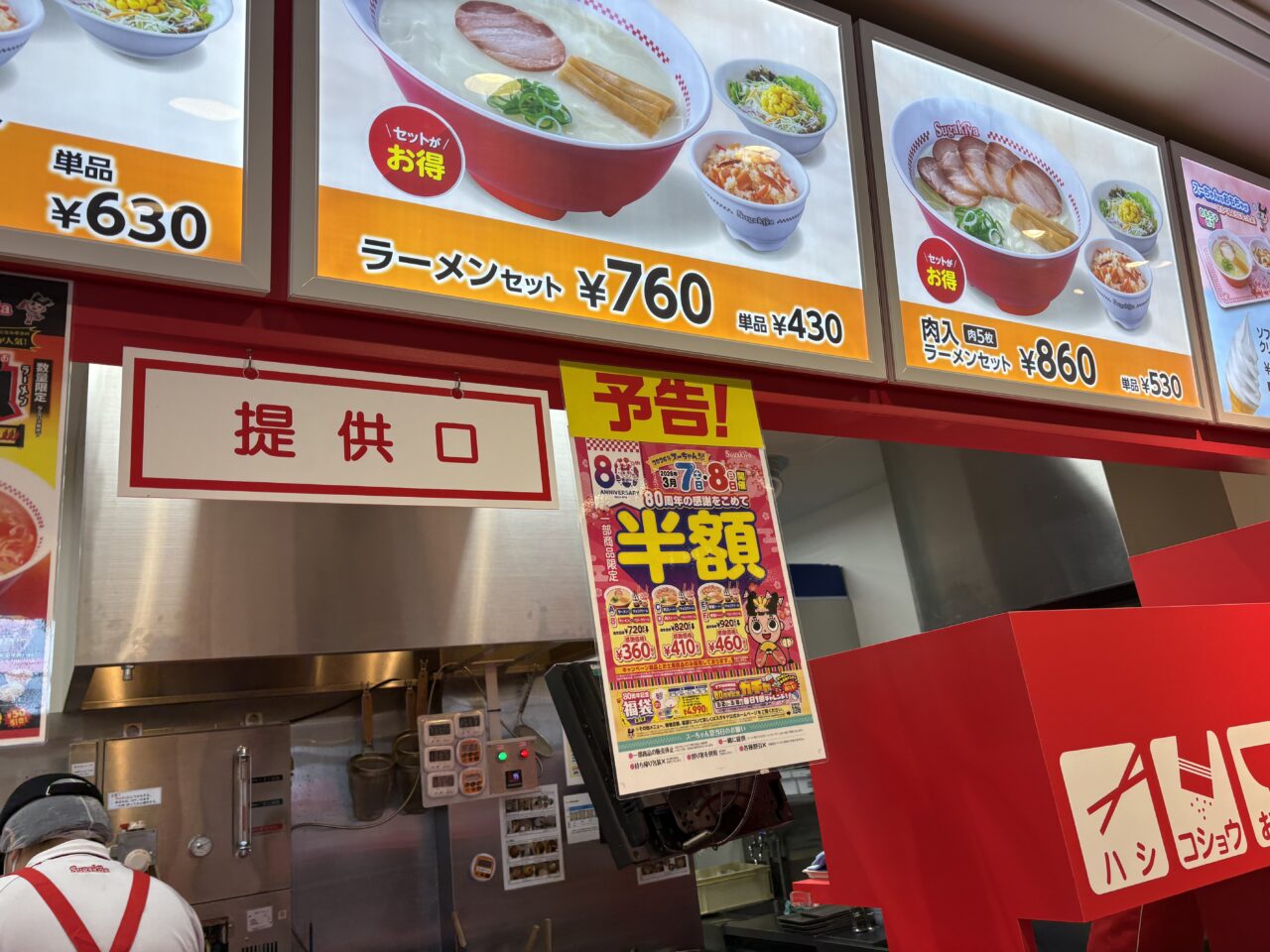 スガキヤが創業80周年を迎えるということで、キャンペーンが各種行なわれるそうです。周年キャンペーンの第1弾として2026年3月7日(土)、8日(日)の2日間は、人気商品のセットが半額になる「スーちゃん祭」「寿祭(ことぶきさい)」を同時開催するそうです。スーちゃん祭では、A~Fの6種のセットメニューが通常価格の半額になります。