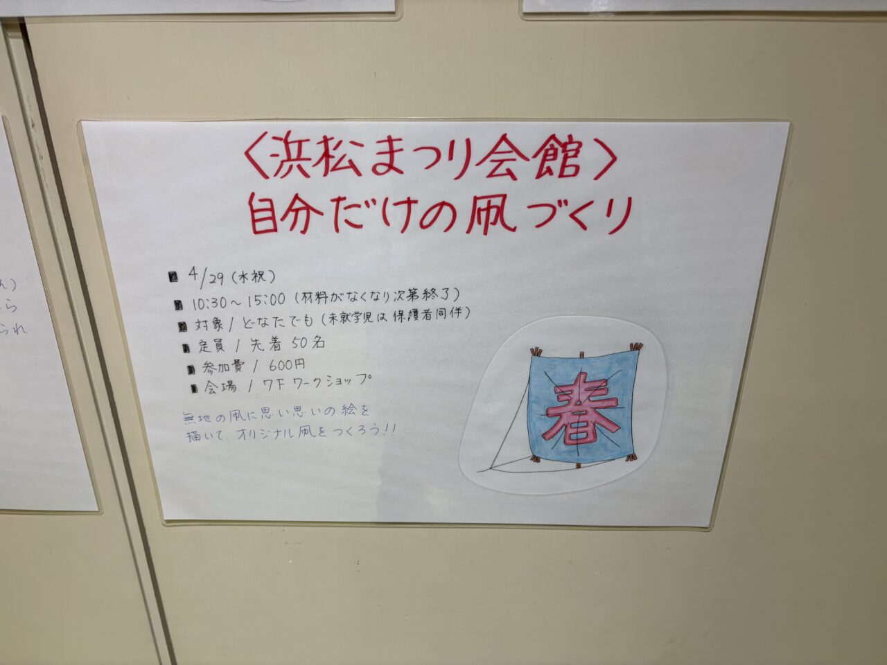 4月29日(水・祝)は、浜松まつり会館による自分だけの凧作りが行われます。参加費600円で、材料がなくなり次第終了の当日受付となります。ゴールデンウィークの5月3日(日)、5日(火・祝)には、mahaloによるカスタムビーズの小物を作ろう!で、800円でかわいいビーズ小物が作れます。当日10時から整理券が配布されます。