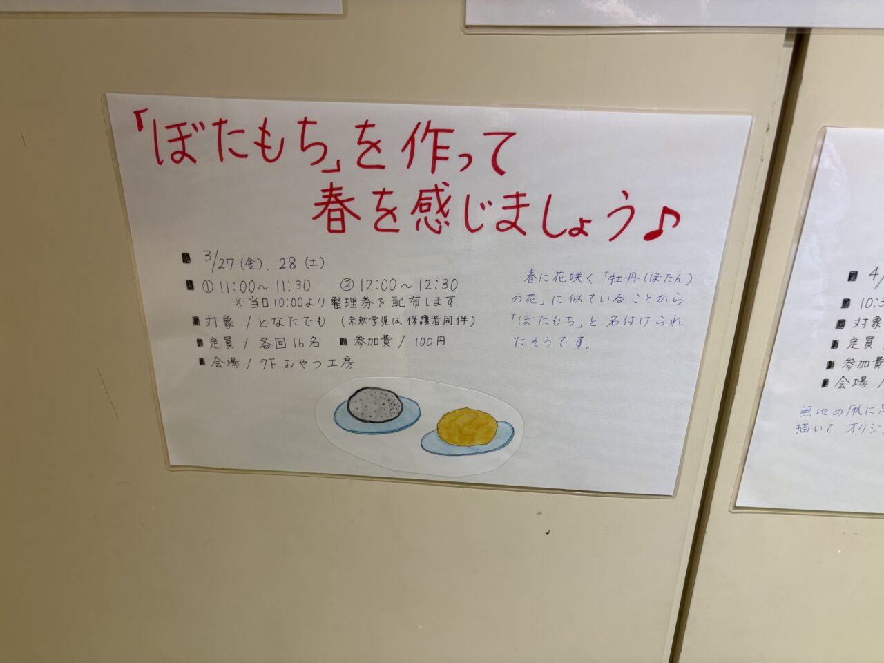 2026年3月27日(金)、28(土)はぼたもち作りです。参加費100円で春のお菓子ぼた餅を作ることができます。当日10時から整理券が配布されます。4月4日(土)は静岡ブルーレヴズによるラグビー体験無料教室があります。こちらはネットから事前予約が可能です。