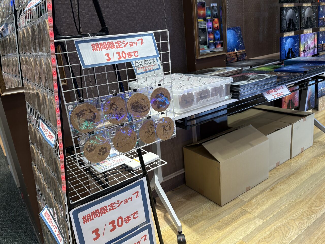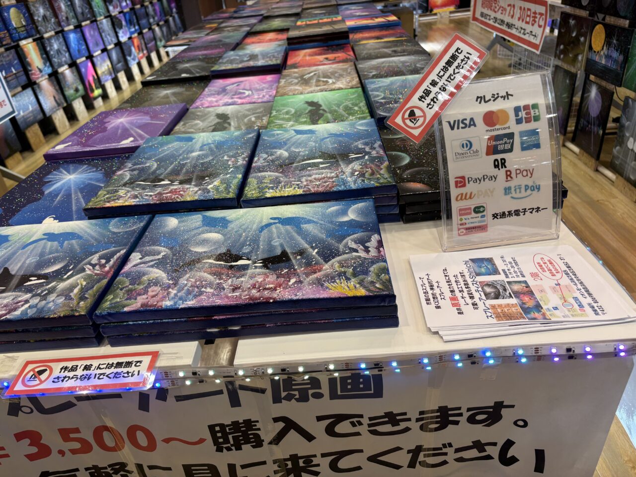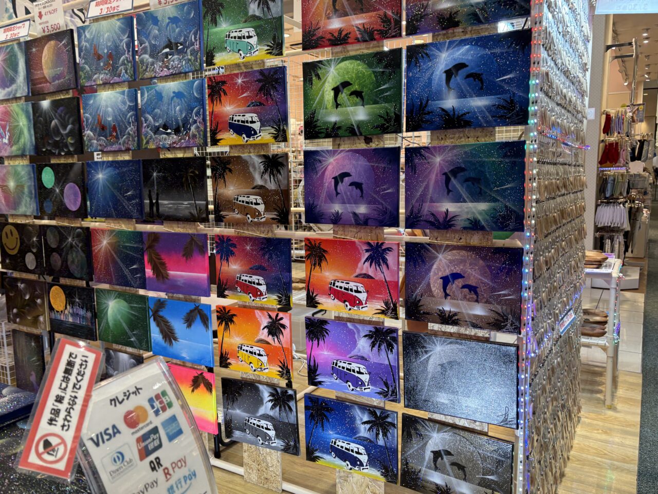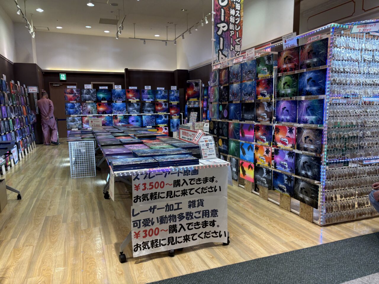 スプレーアートをご存知ですか?シャッターアートや壁画アートなどで多くの方が一度は目にしたことがあるかと思います。そんな、市販の缶スプレーで描く幻想的で神秘的なアートが商品となって販売しています。スプレーアーティストのShinichiさんの作品で、イオンモール浜松志都呂の2階にあるチュチュアンナの隣りのテナントに作品がたくさん飾られています。お店の前を通るだけで圧倒される作品たちです。調べてみるとスプレーアートといっても様々な技法があるようで、アーティストとしてもパフォーマーとしても活動している方がたくさんいらっしゃいます。路上アーティストとして、その場でスプレーアートの作品を描いている方もいるようです。魔法のように完成されていく過程は見るだけでワクワクします。そんなスプレーアートの作品が所狭しと並んでいます。スプレーアートは完全1点物なので、この世に1つしかない自分だけのお気に入りの作品を探してください。2026年3月19日から30日まで期間限定販売中です。レーザー加工で制作した可愛い雑貨もありましたよ。