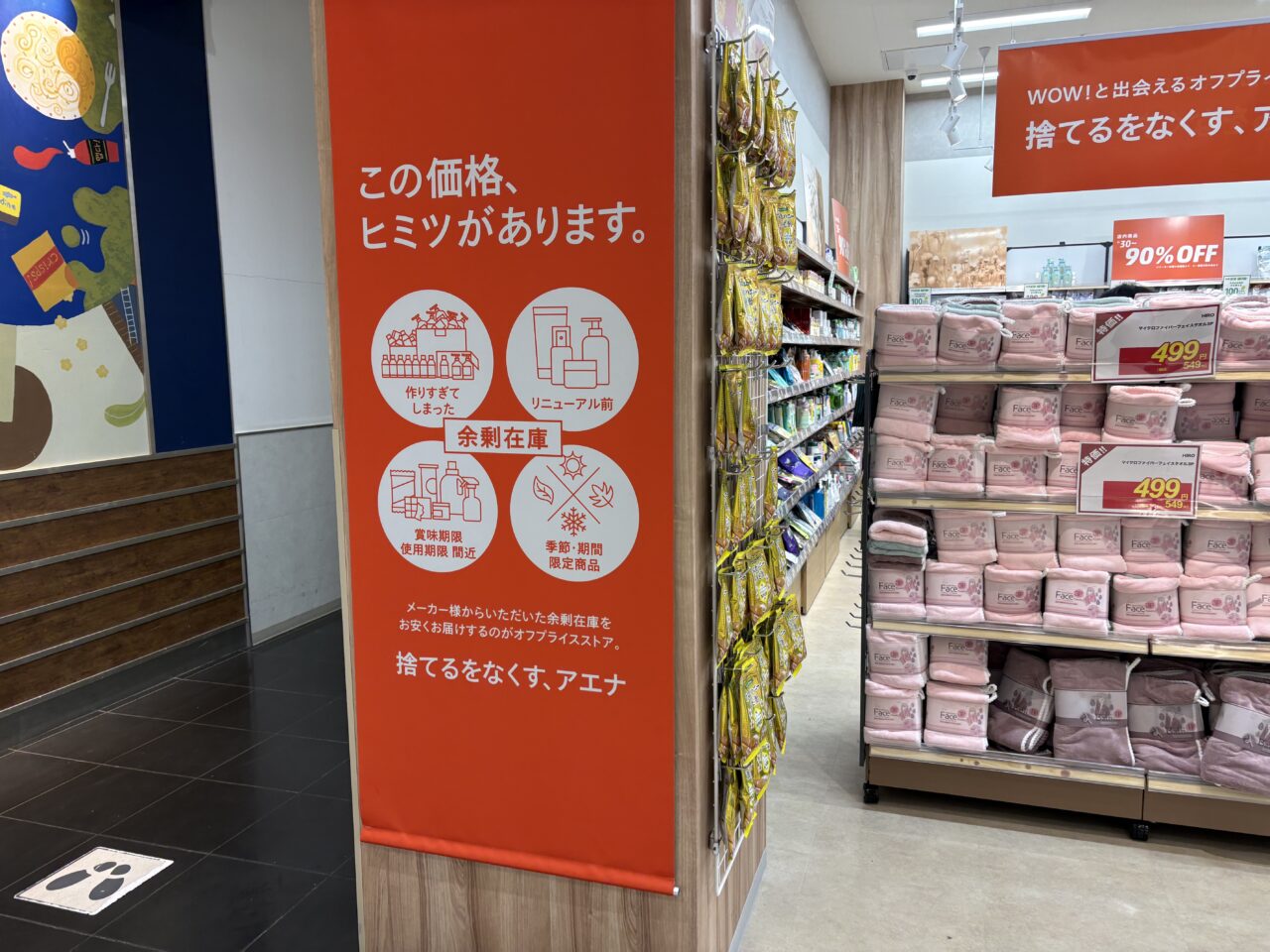 リニューアル商品や、賞味・使用期限間近なもの、作りすぎてしまった物など理由は様々ですが、破棄するのではなく必要としている人に安く手に渡るようお届けしてくれるそんなオフプライスストアです。