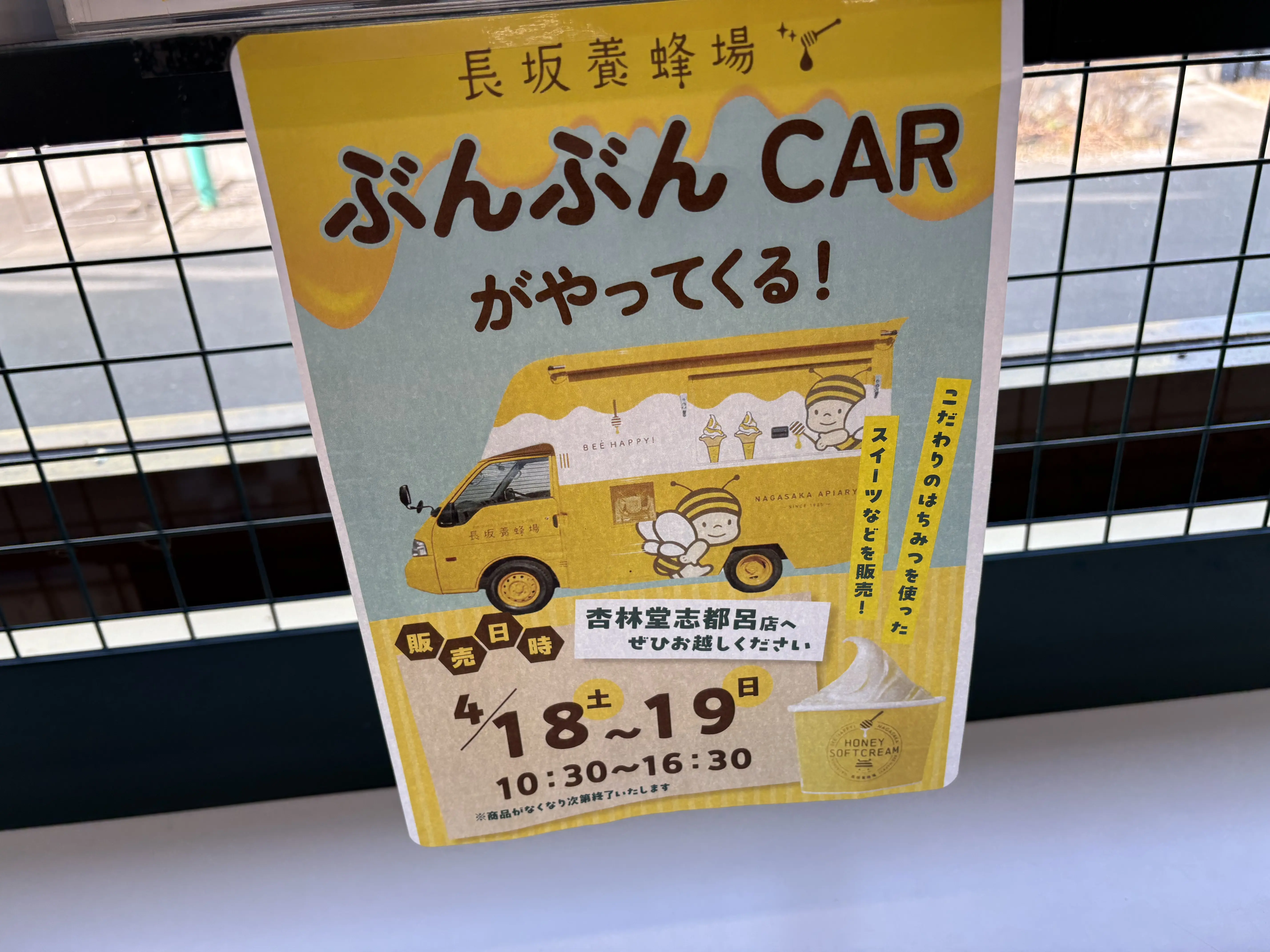 杏林堂志都呂店に長坂養蜂場ぶんぶんCARが2026年4月18日(土)、19日(日)の2日間、10:30から16:30までやってきます。養蜂場ぶんぶんCARとは、2025年4月からスタートしましたはちみつソフトクリームのキッチンカーです。長坂養蜂場のマスコットキャラクターのぶんぶんが可愛く描かれた黄色いキッチンカーは目を惹きます。販売されるはちみつソフトクリームは、多い日は1日でなんと!2,000個以上も売れたことがある大人気商品です。クリームにはちみつを練りこみ、さらに提供するときに追いはちみつがかけられる特別仕様です。はちみつを堪能できるソフトクリームです。長坂養蜂場の三ヶ日本店・街中のスイーツアトリエの店舗に行かないと食べられないソフトクリームが、ぶんぶんCARに乗ってやってきます。この土日は、暑くなるとの天気予報も出ています。まさにソフトクリーム日和が期待される2日間、はちみつソフトクリームを召し上がりに杏林堂志都呂店へぜひ足を運んでみてください。